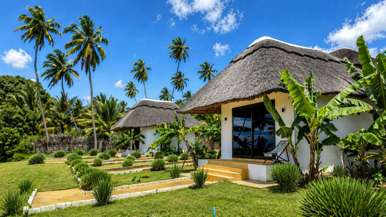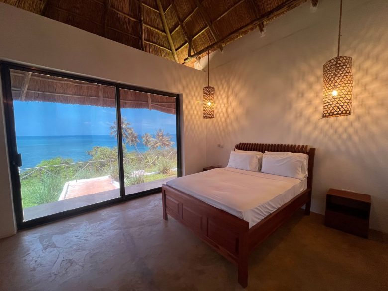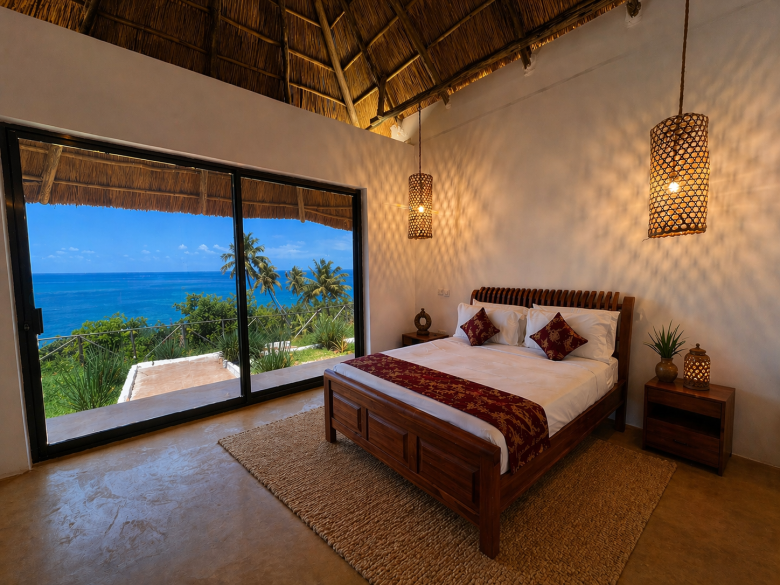 Celebrate the allure of our beachfront African-themed bungalow, seamlessly blending modern amenities with locally inspired decor, offering captivating views of the stunning coastal landscape