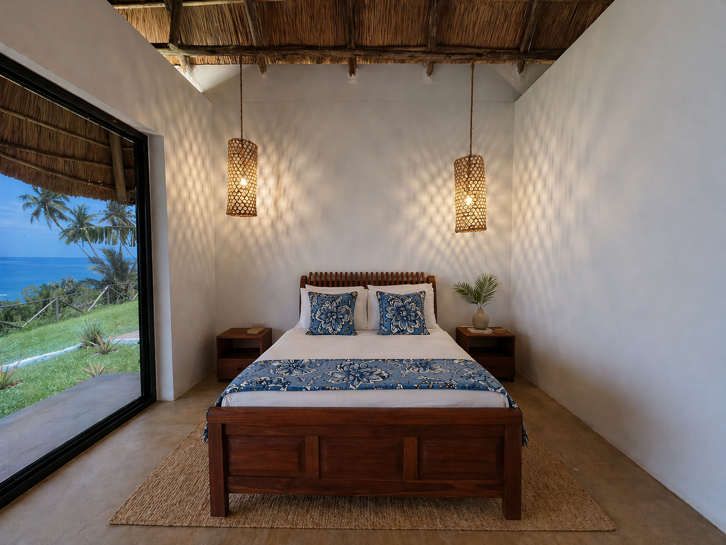 Experience the essence of our beach front African-themed bungalow room, thoughtfully designed with a blend of contemporary comfort and locally curated furnishings. Adorned with a captivating collection of African artwork, our bungalows feature gleaming modern bathrooms indoors. The expansive private terraces offer an extended living space, perfect for outdoor relaxation